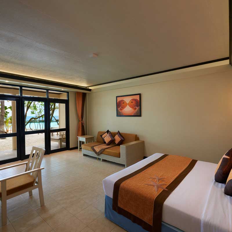 高级客房是家庭和小团体(包括孩子)的理想选择。他们宽敞舒适地容纳约四人,同时设计了明亮的色彩和舒适的装饰。一个露天浴室,提供海洋和赤土陶器地板的壮丽景色,增添了奢华感。