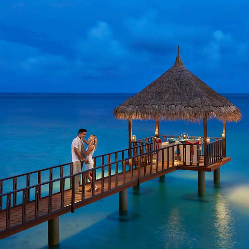 酒店的水上阁楼提供美丽的夕阳景色,在印度洋上方的半圆形甲板上建造的白树木和茅草屋顶平房上提供几乎非常漂亮的住宿。室外浴缸,独立用餐区,酒吧,私人甲板和无边泳池只会增添辉煌的体验。