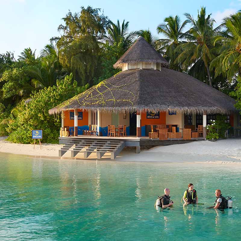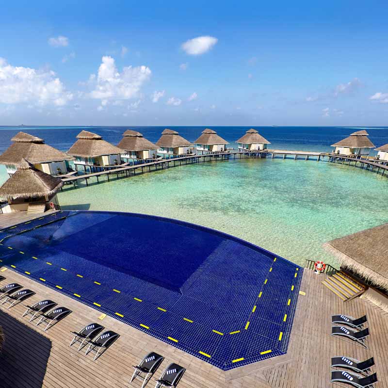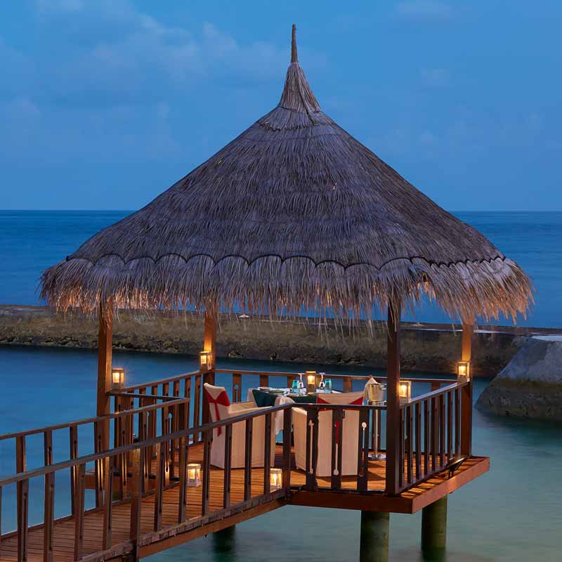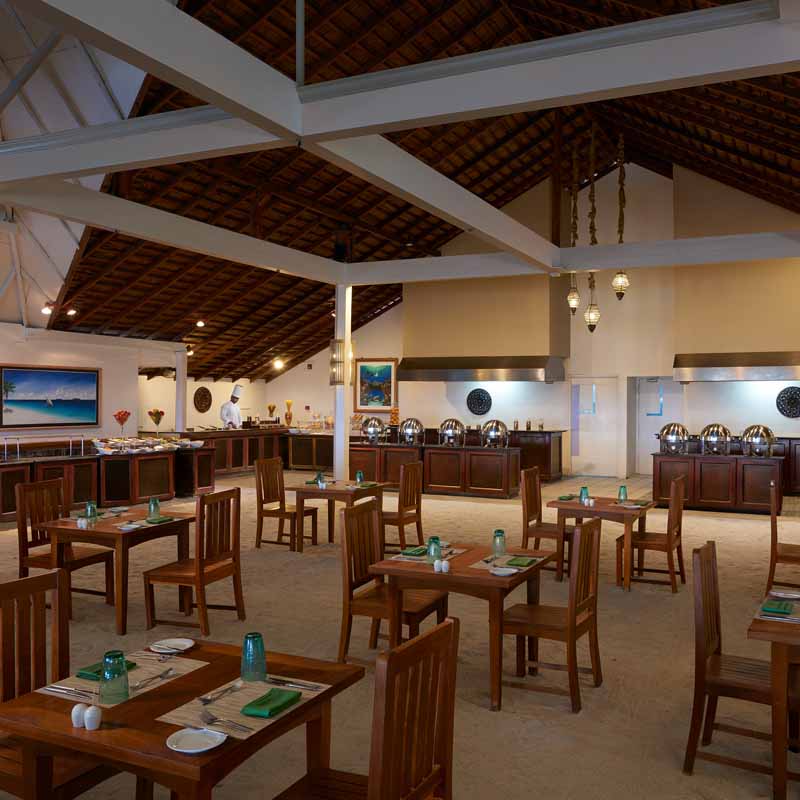 Malamathi酒吧餐厅靠近水上别墅,让客人可以享受美味的餐点。这家餐厅享有美味的日落美景,提供欧陆式菜肴,点菜菜单,自助餐和鸡尾酒吧。游泳池甲板上的多个行动台和半开放环境增加了岛屿度假的感觉。