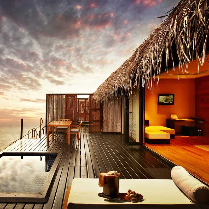 Set amidst enchanting sunsets, this over water villa has its own outdoor deck which offers direct access to the waters below. Cosy up in a large four poster king size bed, enjoy a lazy dip in the plunge pool or watch movies on your very own home theatre system. You can also view vibrant marine wonders that call these waters home from a special glass panel in each villa.