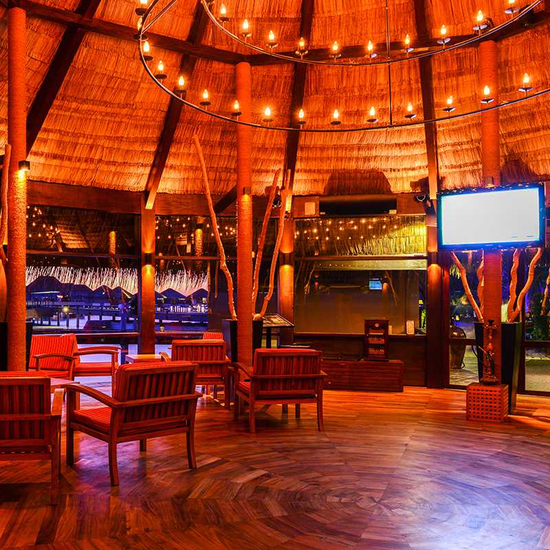Providing an intimate place to unwind with friends and family, the Main Bar is just off the island and within easy reach of the water villas. Overlooking the ocean and designed with a three sided wooden deck, the bar serves up a wide array of beverages and delicious cocktails which can be enjoyed both in the day and at night.