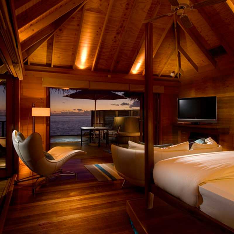 Located on a private area of the lagoon, this luxury villa can be reached by jet-boat or by a private walkway. A secluded hideaway, this two bedroom villa has a large infinity pool, comfy living area with glass flooring providing amazing ocean views, a personal island host at any time of day and even a circular rotating bed to fully appreciate magical sunsets.