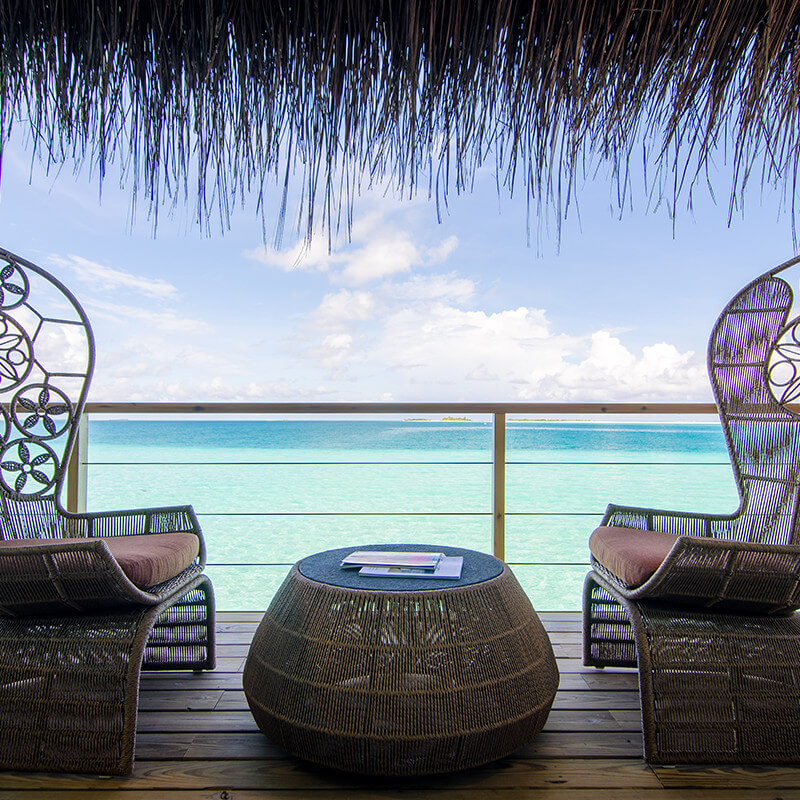 The 180sqm overwater villas inspired by the vibrant colours of the French Riviera, offer direct access to the ocean and feature a freshwater pool (6m) as well as uniquely designed furniture pieces with large luxury rocking chairs and an outdoor daybed on a private sundeck.